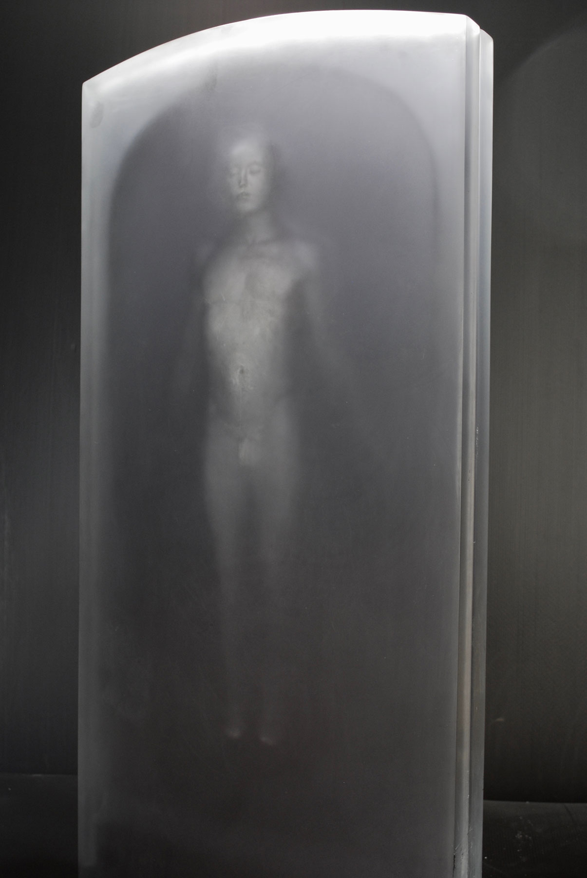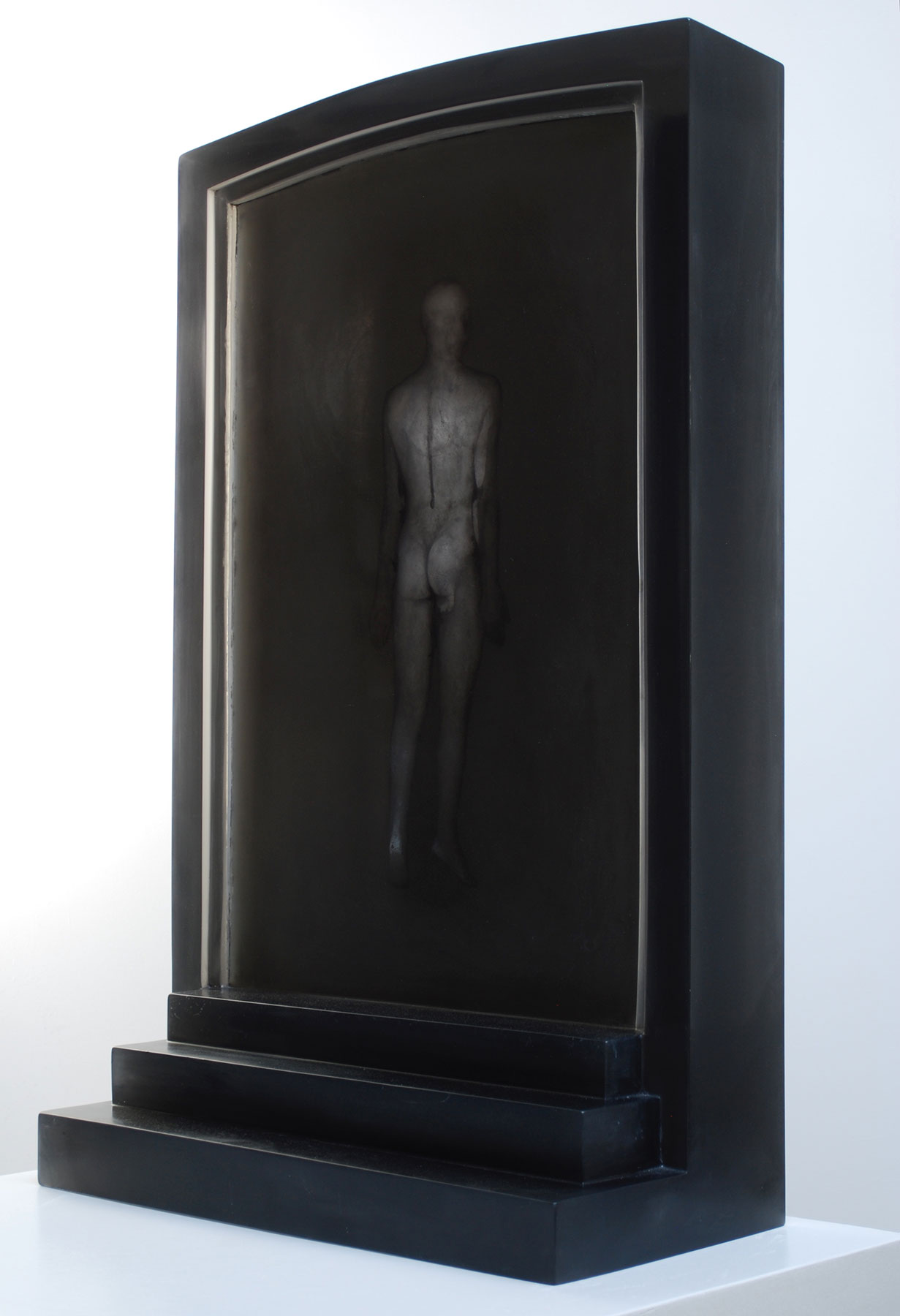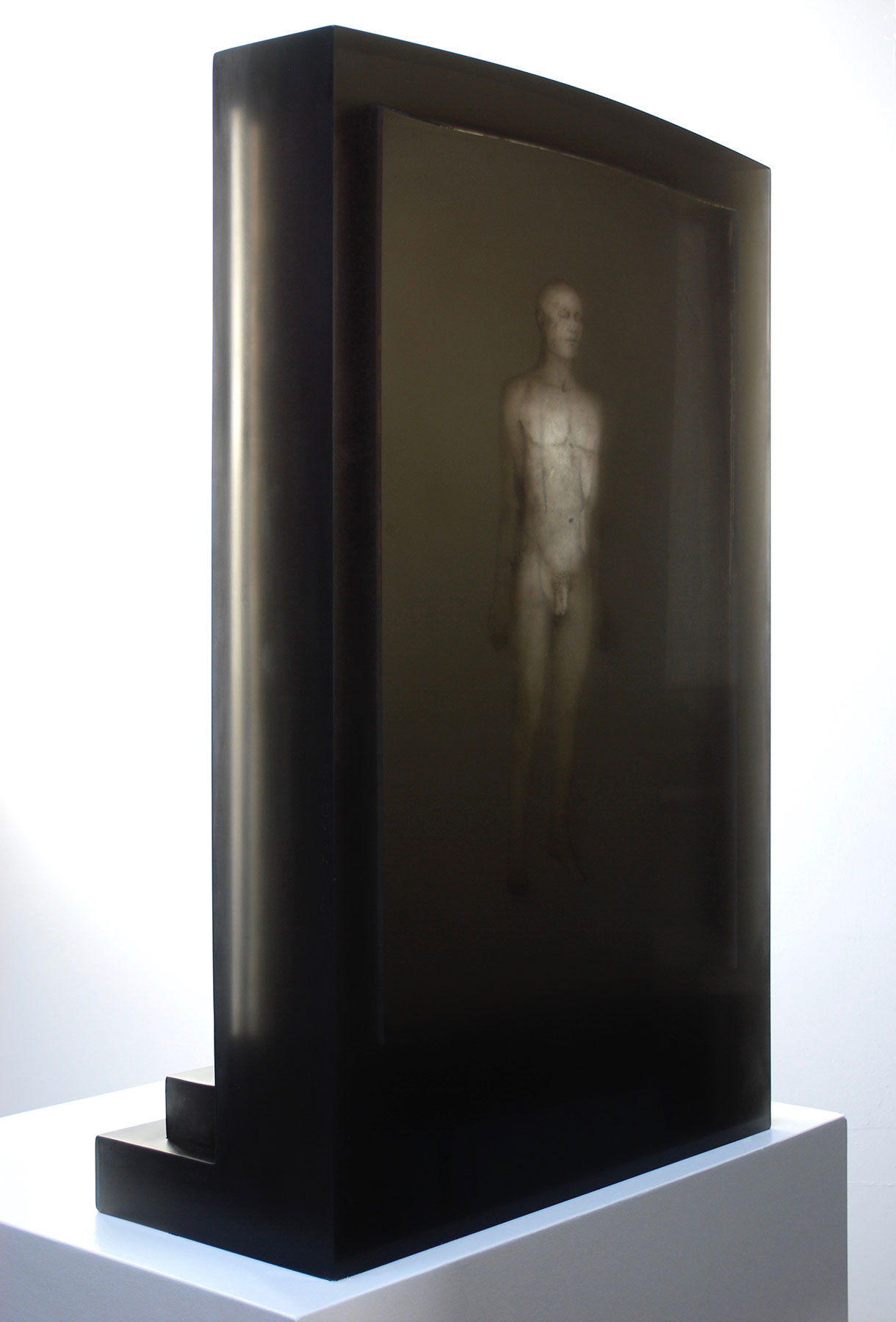He mounts the five etching plates in heavy pewter surrounds as floor sculptures, all reflecting torsoes and highlights. [These are the Navigator series, which complement and extend earlier Journeyman series.] Andrew Lambirth