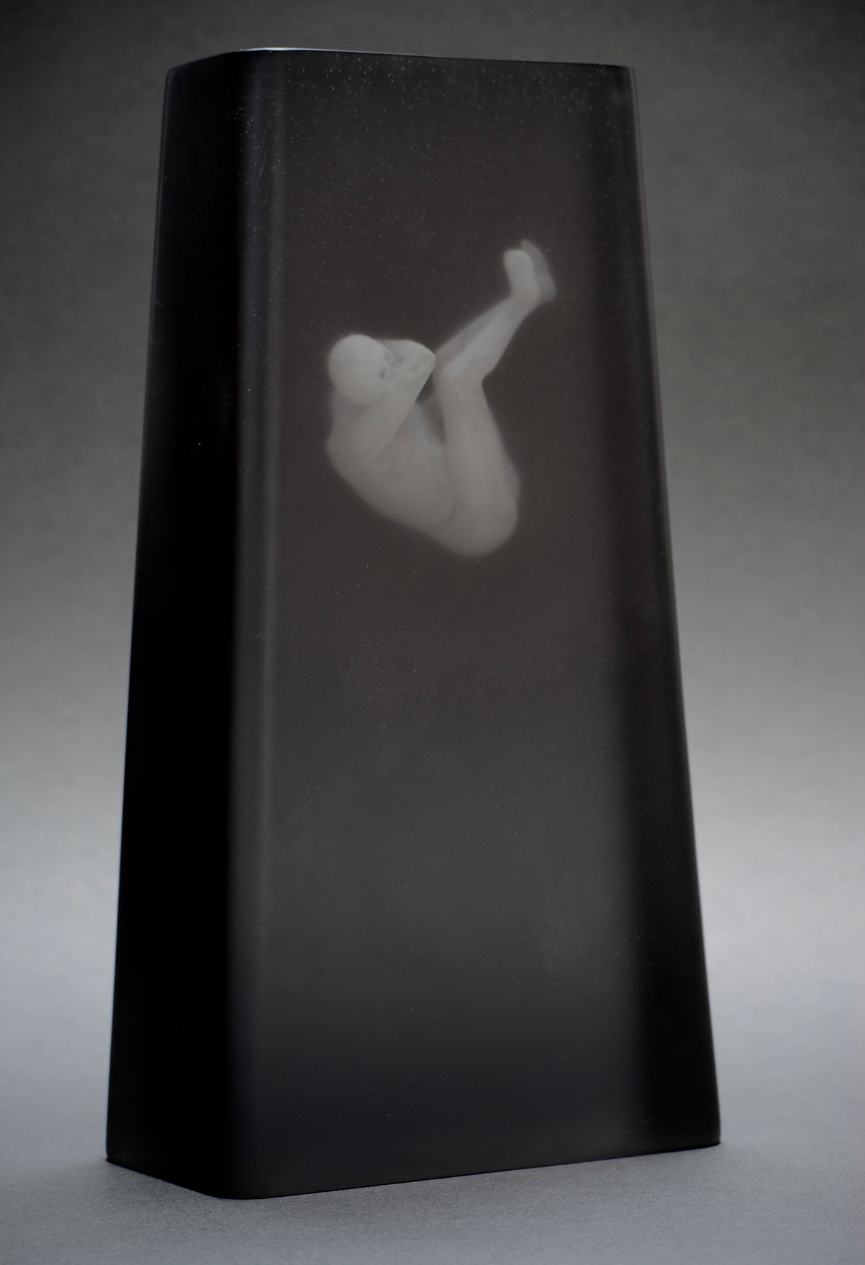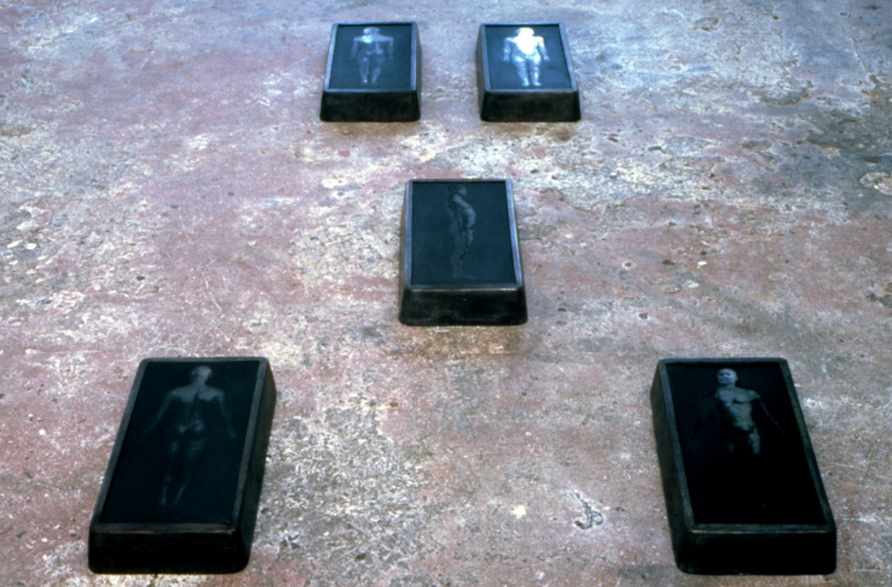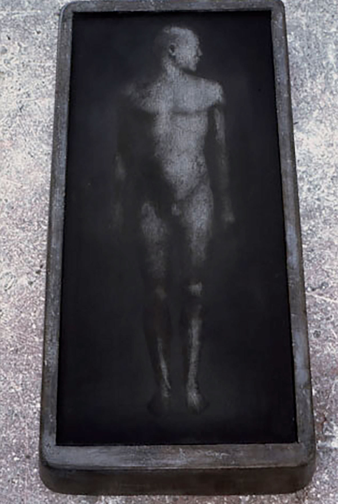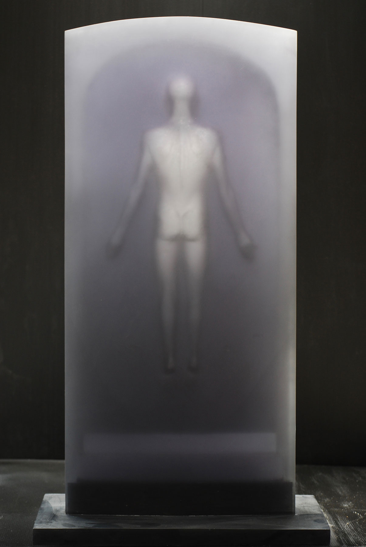 He mounts the five etching plates in heavy pewter surrounds as floor sculptures, all reflecting torsoes and highlights. [These are the Navigator series, which complement and extend earlier Journeyman series.] Andrew Lambirth